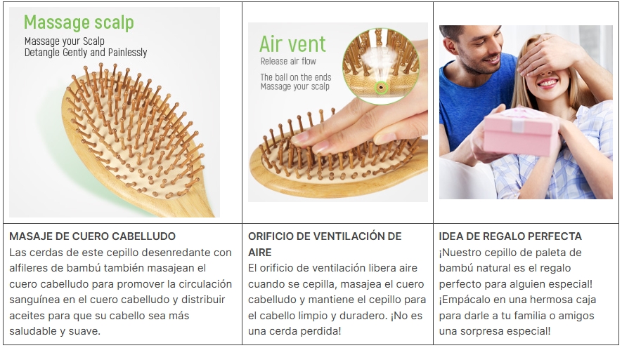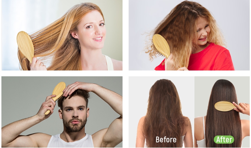 Las cerdas de bambú naturales ayudan a extender el aceite del cabello de manera más uniforme, lo que hace que el cuero cabelludo sea saludable y alise eficazmente el cabello encrespado o desordenado.
